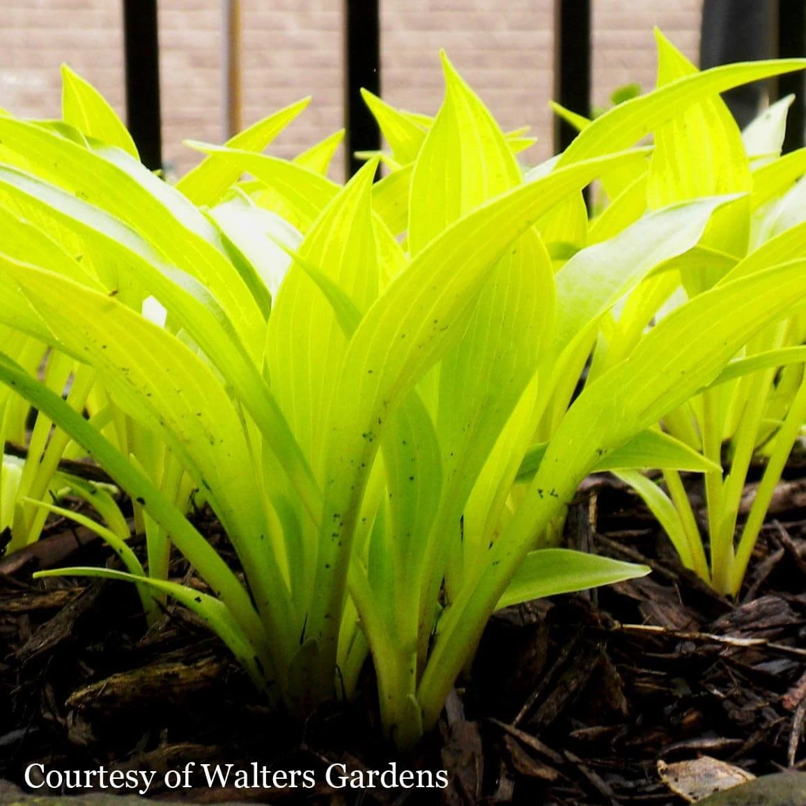 Miniature Hosta ‘Munchkin Fire’ emerges with bright yellow green to gold, narrow, elongate leaves that stand almost upright. ‘Munchkin Fire’ is a vigorous Plantain Lily that holds its color all season and is topped by lavender blooms on 20″ scapes in midsummer. Mini Hosta ‘Munchkin Fire’ is rapidly becoming a favorite for its perky habit and brilliant color. Put it in a mixed container to make the arrangement pop!